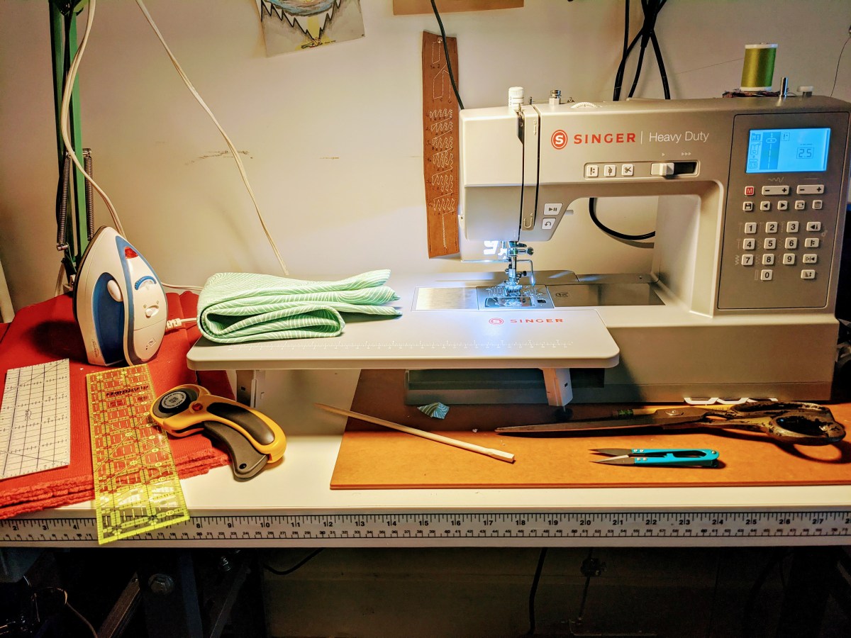 Sewing: Just got this Singer HD 6800 computerized machine. It’s my first computerized machine and sounds like a printer. I prefer control, and I seem to have more than I have ever had, even compared to my servo’d Sailrite LSZ1. Needle up/down is life changing. I also have the extension table, which is very useful when you don’t have a dedicated sewing area. Expect a review. Here I’m using Coats thread, but I have Gutermann around as well. Chopstick folding tool, for getting the points clean on the miter corners, generic thread cutter, and bic lighter fir finishing thread ends round out my sewing tools.