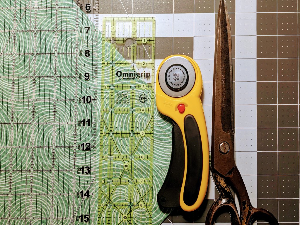 Starting with the cutting of the fabric: I’m using a rotary tool and acrylic ruler with cutting mat. You’ll see a mix of brands here. Fiskars mat and ruler plus an Omnigrip. Olfa rotary tool, this one is a little more ergonomic than others and has a far superior cutting edge. Mid-20th century Wiss shears I restored to round out the cutters. Expect another post on cutting fabric, this is my level 3 set-up, I’ll share what level 1 and 2 look like + cutting synthetics.